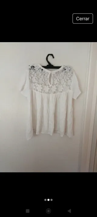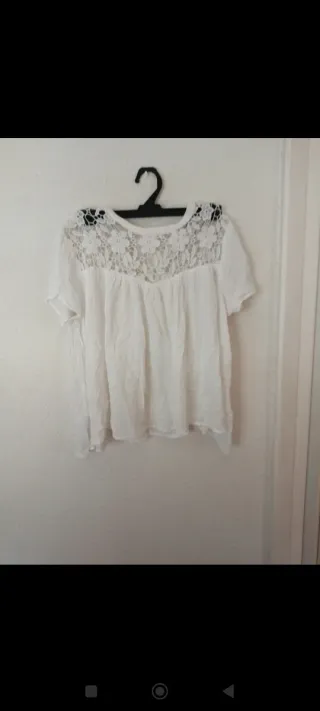 Blusa de manga corta con detalles de encaje en el cuello y los hombros. - Diseño con escote en V. - Tejido ligero y vaporoso. - Acabado con puntilla en el bajo.