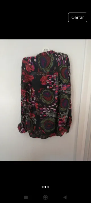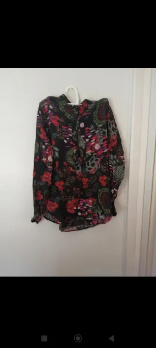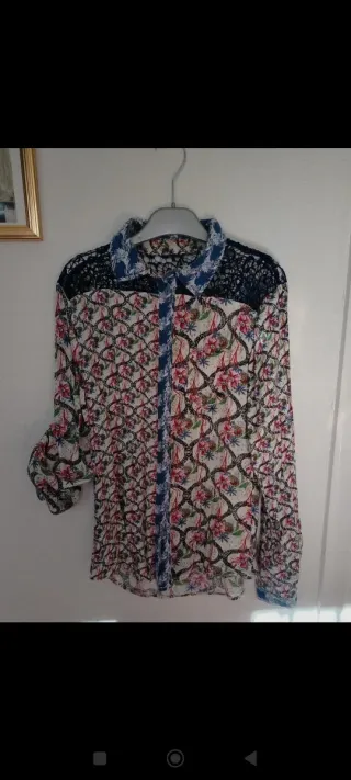 Camisa de manga larga con un estampado floral vibrante y detalles de encaje. - Diseño con cuello. - Cierre de botones. - Tejido ligero.