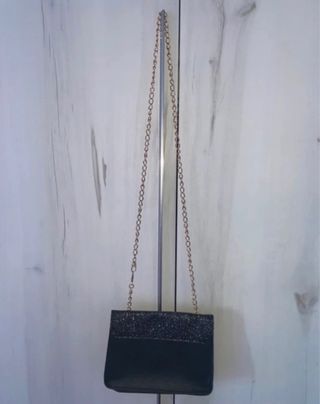 Bolso de mano con un diseño elegante y moderno. - Acabado brillante en la solapa. - Cadena dorada para llevar al hombro. - Cierre de seguridad dorado.