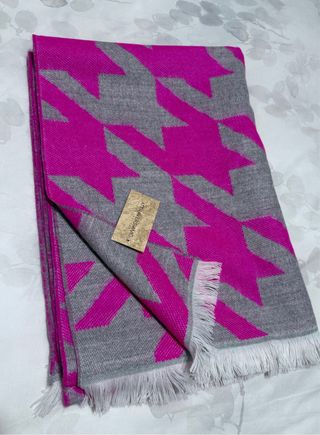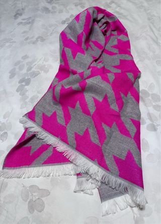 Bufanda con estampado clásico houndstooth. - Diseño en rosa vibrante y gris. - Acabado con flecos en los extremos. - Medida 180 x 70