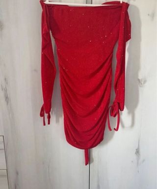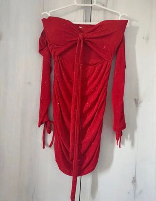Vestido elegante con un diseño llamativo y detalle. - Diseño ceñido al cuerpo. - Escote Bardot. - Mangas largas. - Detalle de lazo en el escote. - Tejido brillante. Usado 1 vez