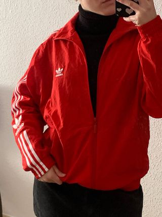 Icónica chaqueta Adidas Originals en color rojo vibrante. Destaca por el logotipo del trébol en el pecho y el detalle de la marca en la manga, un toque retro muy buscado. Estado: Muy bueno, cuidada al detalle. Talla: M (38). Estilo: Perfecta para un look 'streetwear' o deportivo clásico. ¡Es una prenda que no pasa de moda!