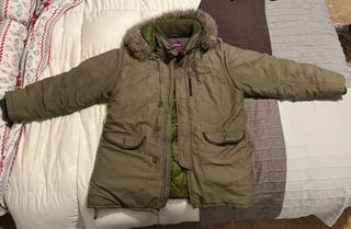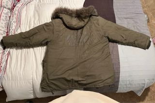 Chaqueton Rocawear de color verde oliva, ideal para el frío. Cuenta con un diseño moderno y funcional. - Capucha con pelo sintético. - Cierre de cremallera y botones. - Bolsillos frontales con solapa. - Forro interior acolchado. - Usado pero en muy buen estado