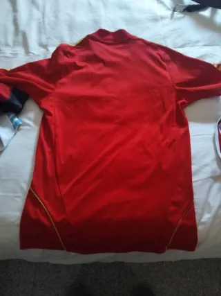 Camiseta de fútbol de la selección española. - Diseño clásico con detalles en dorado. - Escudo de España bordado en el pecho. - Logo de Adidas. - Tecnología ClimaCool para mayor transpirabilidad.