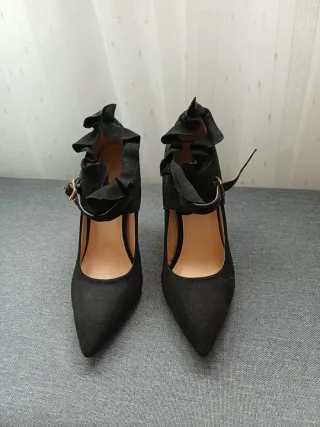 Elegantes tacones negros con un diseño de volantes. - Material de ante. - Correa ajustable al tobillo con hebilla dorada. - Punta fina. #tacones #negros
