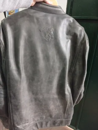Chaqueta de cuero para hombre, diseñada para motociclismo. Cuenta con protecciones certificadas. - Certificación CE EN1621-1:2012. - Diseño con logo Ride with Style. - Incluye un gráfico de un motorista y una bandera a cuadros.