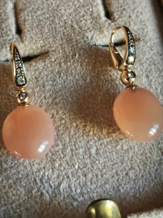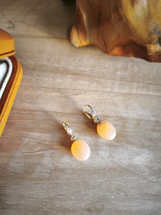 Elegantes pendientes de oro de 18 kilates con detalles de diamantes y gemas en tono anaranjado. Diría que las piedras son cornalinas. - Diseño colgante. - Acabado brillante. - Se entregan en el precioso estuche que aparece en la foto ( no es el original).