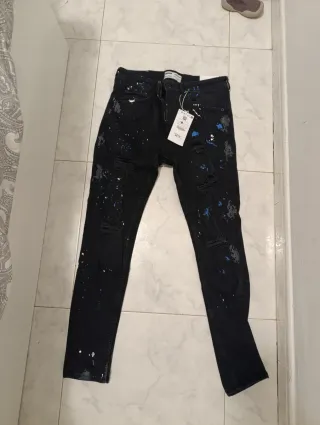 Pantalón vaquero negro con un diseño moderno de manchas de pintura. Esta nuevo lleva todas las etiquetas, se compro en talla pequeña y nunca se devolvio, precio original 35,99€ - Efecto salpicaduras en varios colores. - Diseño desgarrado en algunas zonas. - Talla 40.