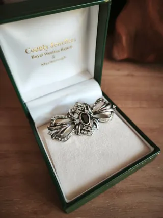 Elegante broche de plata de ley 925 con contraste y pedrería con un diseño intrincado y detalles de marcasita. - Plata de ley 925. - Diseño tipo lazo con filigranas. - Pedreria en colores morado azul y amarillo - Se entrega en caja antigua de colección ( no es la original)