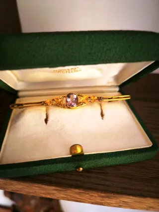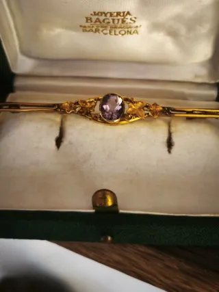 Elegante broche antiguo con un diseño modernista realizado en plata sobredorada. Una pieza delicada y con un toque vintage. Original de época, procedencia catalana - Diseño floral con amatista central. - Longitud: aprox. 8 cm. - La caja está incluida ( no es la original)