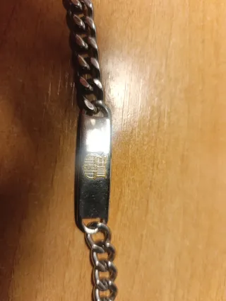Cadena de acero con placa grabada. - Diseño de eslabones curvos. - Placa rectangular con grabado escudo FCB - Combinación de colores plateado y dorado.