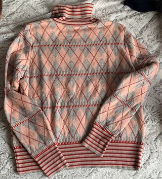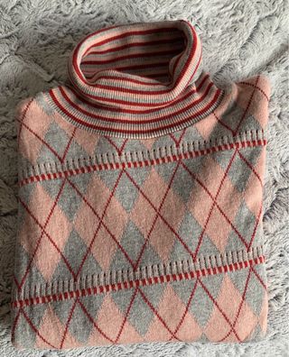 Jersey de punto con cuello alto y estampado de rombos. - Diseño de rombos en tonos rosa y gris. - Cuello y puños con rayas rojas y grises. - Tejido de punto agradable.