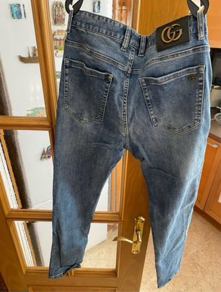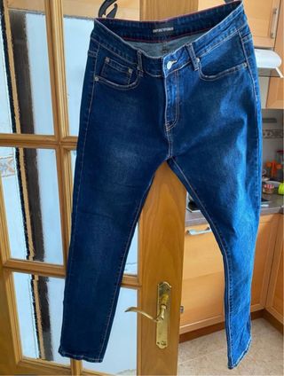Pantalones vaqueros de corte moderno. - Diseño clásico de cinco bolsillos. - Cierre de botón y cremallera. - Costuras en contraste.