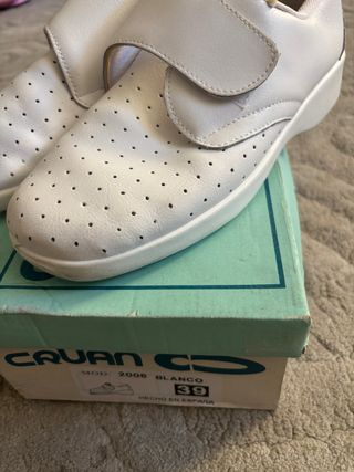 Zapatos de trabajo de la marca CAUAN en color blanco y talla 39. Cuentan con un diseño perforado y cierre de velcro. - Modelo: 2006 - Color: Blanco - piel - Talla: 39 - Cierre: Velcro - Fabricado en España - Como nuevo