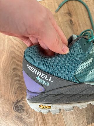 Zapatillas Merrell con tecnología Goretex. - Color principal azul verdoso. - Detalle en morado en el talón. - Suela de goma con buen agarre.