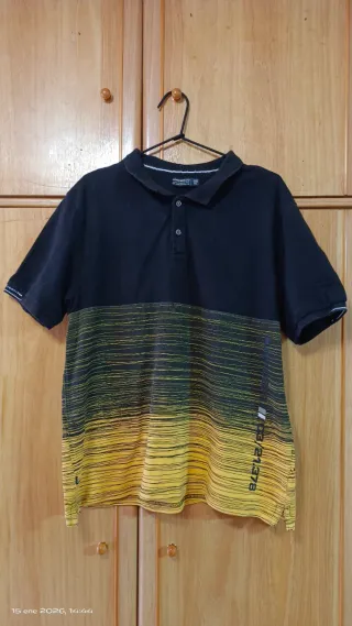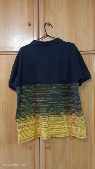 Polo de manga corta con un diseño moderno y llamativo. - Parte superior en color negro. - Parte inferior con un degradado de rayas amarillas y negras.