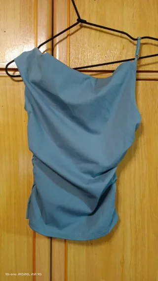 Top de tirantes finos con un diseño elegante y moderno. La tela tiene un acabado drapeado y fruncido en un lateral. - Tirantes finos ajustables. - Escote drapeado. - Fruncido lateral.