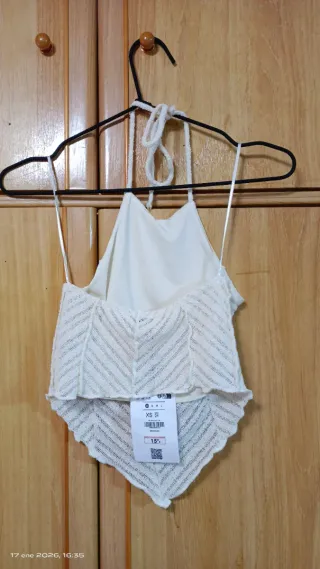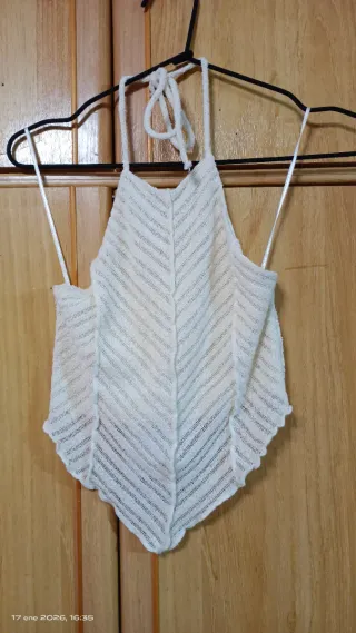 Top de Bershka en color crudo, talla XS. Un diseño moderno y fresco. - Tejido de canalé. - Diseño halter. - Detalle de flecos en el bajo.