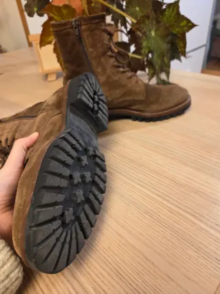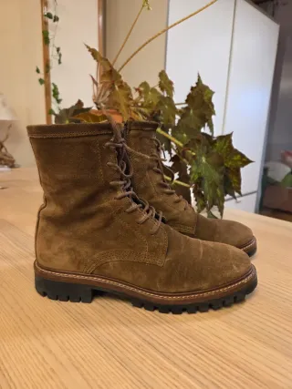 Botines de ante en color marrón. - Piel - Cierre con cordones. - Suela de goma con buen agarre. - Diseño de caña media. - Made in Spain Los compré el invierno pasado por 100euros y me encantan, están como nuevos, solo tienen una pequeña marca milimetrica el el zapato derecho. Los vendo porque no puedo utilizar este tipo de calzado.