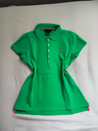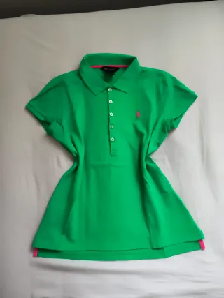 Camiseta polo de Ralph Lauren en color verde vibrante. Aunque la etiqueta pone que es una XL realmente es una S-M - Detalle de logo bordado en el pecho. - Ribete interior del cuello en color rosa. - Dobladillo inferior con detalle en color rosa.