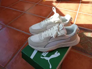 Zapatillas Puma de estilo casual, perfectas para el día a día. - Diseño moderno en tonos beige y blanco. - Cierre con cordones. - Detalle de logo en el lateral.