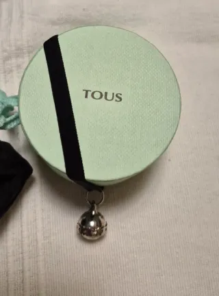Conjunto de caja y bolsa de la marca Tous. - Caja redonda de color verde menta. - Bolsa de tela negra con cordón. - Cinta negra decorativa en la caja. - Colgante con forma de bola plateada.