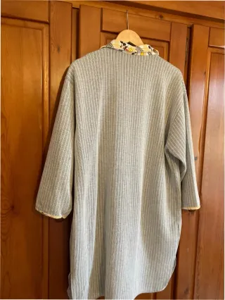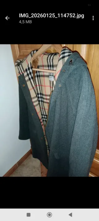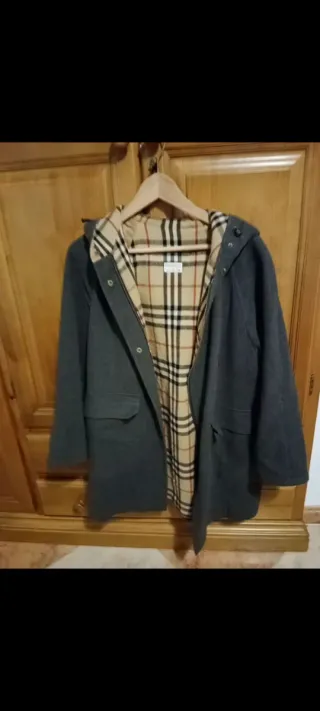 Abrigo clásico Burberry con el icónico forro de tartán. - Exterior en color gris. - Forro interior con estampado de tartán beige y cuadros. - Diseño con capucha. Le arregle las mangas, me iban largas Talla: entre 40 y 42 Estado: bueno, sin defectos importantes. Abrigo elegante y atemporal, ideal para invierno.