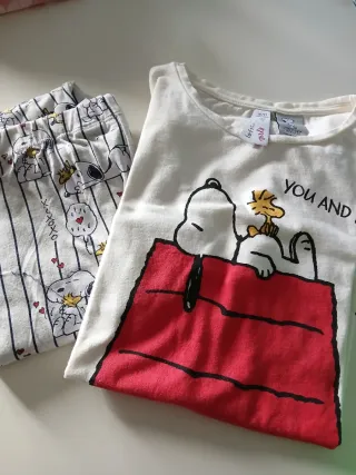 Conjunto de pijama para niña con estampado de Snoopy y Woodstock. - Camiseta blanca con dibujo. - Pantalón a rayas con personajes.