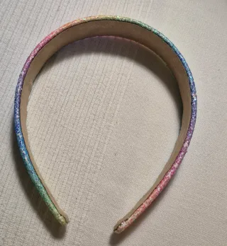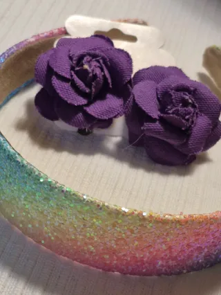 Conjunto de accesorios para el cabello. - Diadema con acabado brillante multicolor. - Dos pinzas para el pelo con forma de flor morada.