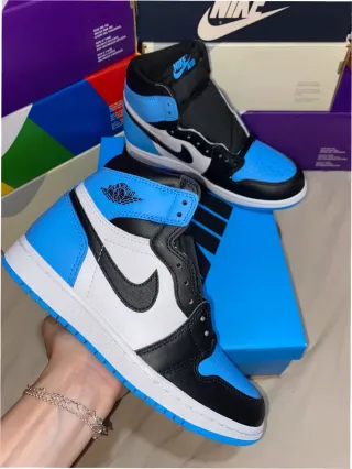 Zapatillas deportivas Nike Air Jordan 1 con un diseño icónico. - Combinación de colores azul y blanco. - Diseño de caña alta.