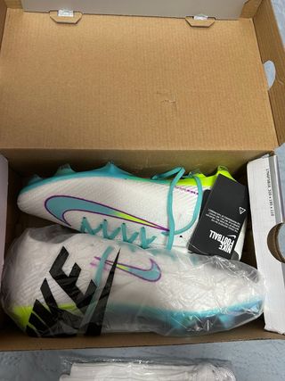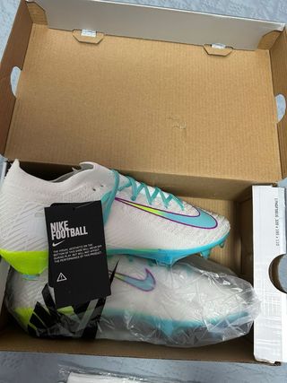 Zapatillas de fútbol Nike Mercurial Air Zoom Vapor 16 FG. - Diseño en blanco con detalles en verde lima y azul. - Cierre de cordones. - Suela FG para césped natural.