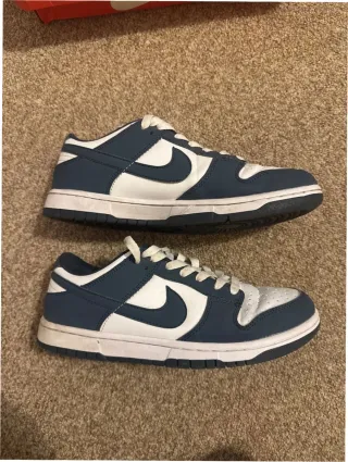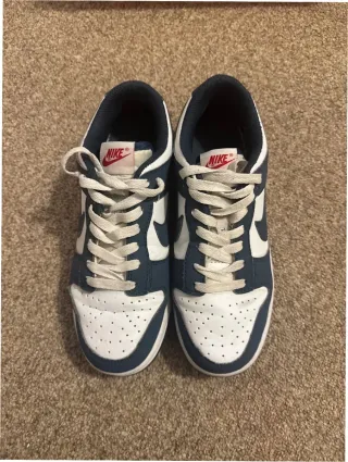 Zapatillas Nike Dunk Low con un diseño clásico en blanco y azul. - Combinación de colores blanco y azul marino. - Diseño de corte bajo.