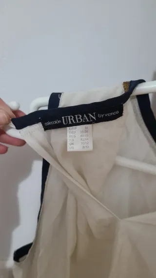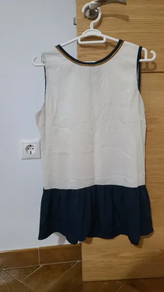 Blusa blanca sin mangas con volante abajo azul marino. En el cuello tiene unos detalles en dorado.