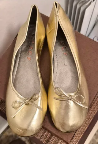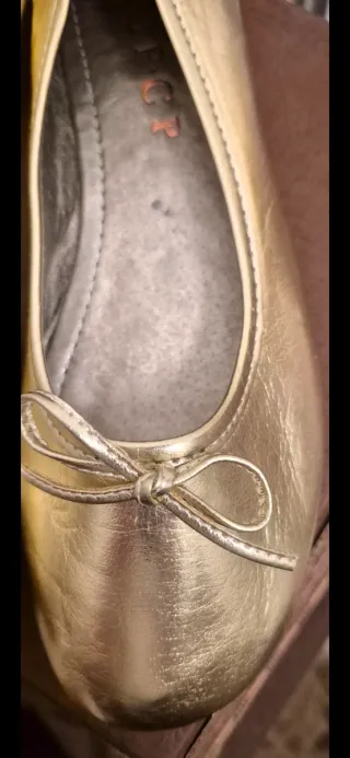Elegantes bailarinas en color dorado, perfectas para añadir un toque de brillo a tu atuendo. - Diseño de bailarina. - Detalle de lazo en la punta. - Marca visible en la plantilla.