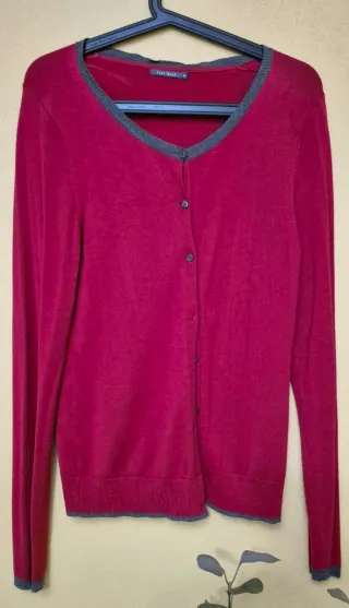 Chaqueta de punto con cuello redondo y cierre de botones. - Ribete gris en cuello y puños. - Diseño liso.