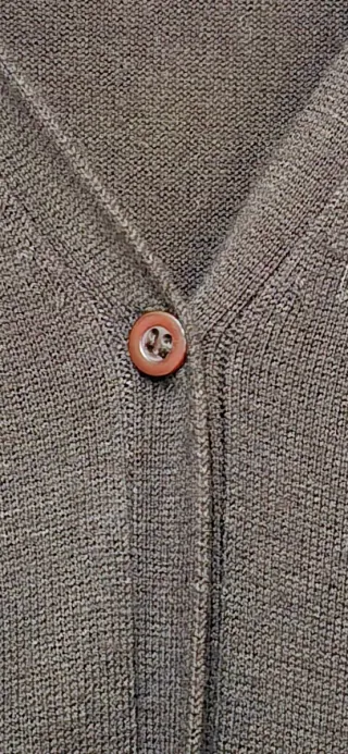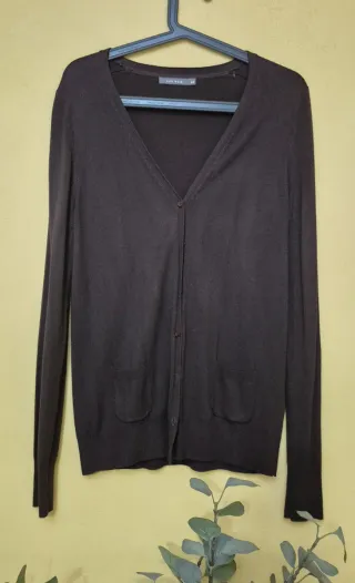 Chaqueta de punto fina en color marrón. - Cuello en pico. - Cierre de botones. - Dos bolsillos delanteros.