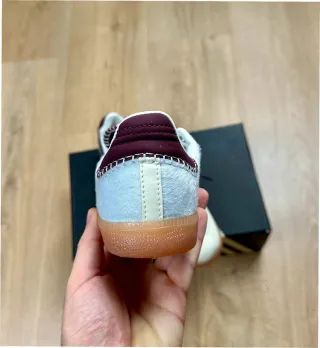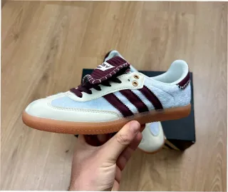 Zapatillas Adidas Samba edición especial Wales Bonner en color crema. Un diseño icónico con detalles únicos. - Parte superior de ante y cuero. - Detalle de las tres rayas en burdeos. - Suela de goma. - Cierre de cordones.