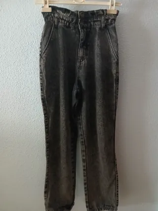 Vaqueros de corte moderno con un llamativo efecto lavado que combina tonos negros y grises. - Cintura alta con detalle fruncido. - Cierre de cremallera y botón. - Bolsillos delanteros y traseros.