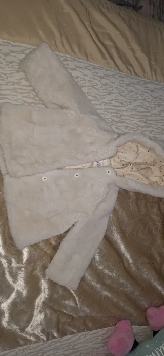 Abrigo suave de pelo en color beige, perfecto para mantener el calor. - Material: Pelo sintético. - Cierre de botones. - Forro interior con estampado de topos. Da mas talla ....yo se la he puesto a mi hija hasta los 24 meses
