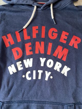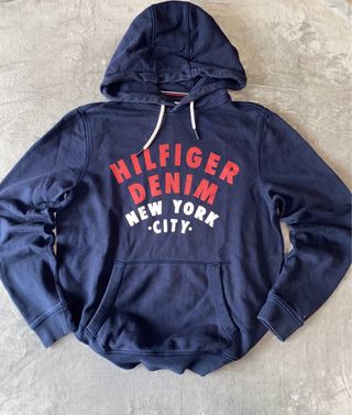 Sudadera con capucha de la marca Tommy Hilfiger. ¡Haz tu oferta !🤝 - Color azul marino. - Diseño con texto Hilfiger Denim New York City en la parte delantera. - Bolsillo canguro. - Cordones blancos para ajustar la capucha.