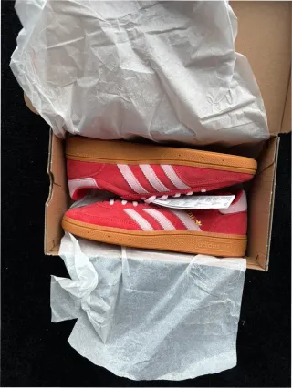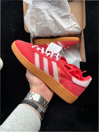 Zapatillas Adidas Handball Spezial en color rojo brillante con detalles en rosa pálido. Suela de goma. - Diseño clásico de las Handball Spezial. - Tres rayas icónicas de Adidas en los laterales. - Logo de Adidas en la lengüeta y el talón.