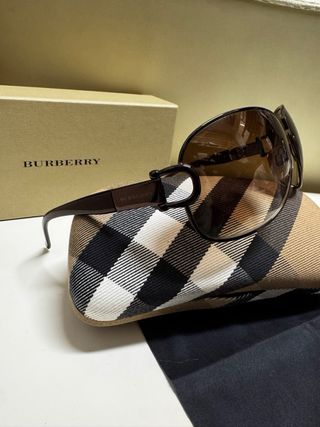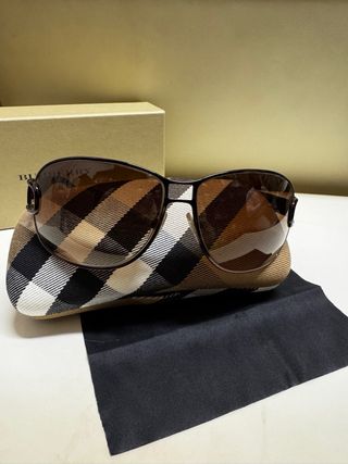 Elegantes gafas de sol Burberry con un diseño distintivo. - Montura en tono marrón. - Lentes con un patrón multicolor característico.