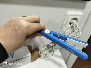 Mini plancha para el pelo, perfecta para llevar de viaje. Su diseño compacto la hace muy manejable. - Color azul y blanco. - Marca Nelly. - Sin estrenar Perfecto para flequillo y dar un retoque rápido al peinado