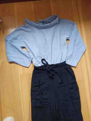 Mono de Zara con un diseño moderno y elegante. Muy estiloso y en perfecto estado. - Parte superior de manga larga en color azul. - Pantalón largo en color negro. - Cintura de goma y con cinturón anudado. - Cuello barco con solapa, cierre en la espalda con 2 botones. - Tela fina, ideal para primavera