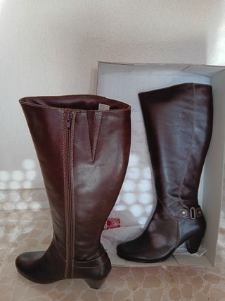 Botas altas de piel en color marrón, completamente nuevas. - Cierre con cremallera. - Detalle de hebilla color bronce en la caña. - Tacón de altura media.