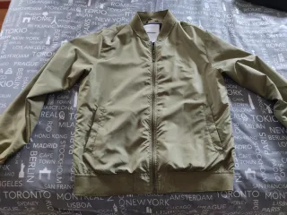 Chaqueta fina estilo bomber entretiempo de Jack Jones. Talla L. Usada durante una semana y guardada desde entonces. - Cierre de cremallera frontal. - Dos bolsillos laterales. - Puños y bajo elásticos.