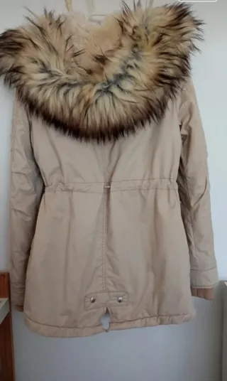 Abrigo con capucha y detalle de pelo. - Pelo se puede quitar y poner. - Cierre de cremallera. - Cintura ajustable con cordón. - Bolsillos delanteros con solapa. - Puños elásticos.