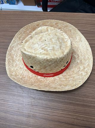 Sombrero de paja con banda roja y logo de Coca-Cola. - Material: Paja - Color: Beige - Banda: Roja con logo de Coca-Cola