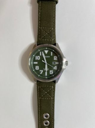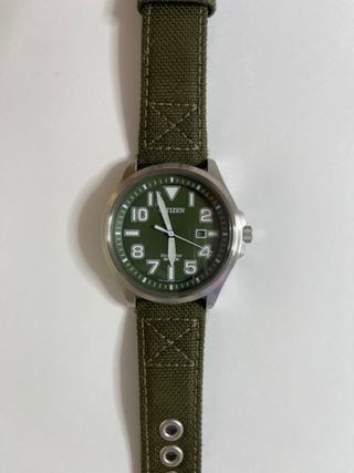 Reloj Citizen con tecnología Eco-Drive y correa de tela. - Esfera de color verde. - Correa de tela resistente en tono verde oliva. - Cierre con hebilla metálica.