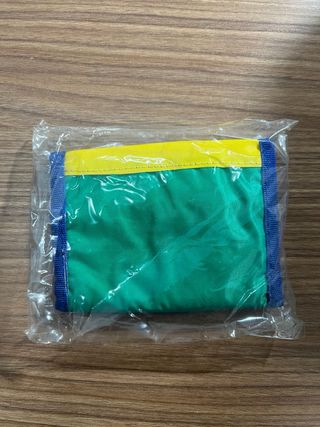 Cartera de la marca Malibu, con un diseño llamativo en azul y amarillo. - Cierre de velcro. - Estampado de palmeras y atardecer. - Detalle de texto CARIBBEAN WHITE RUM COCONUT.